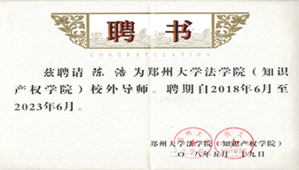 2018年5月公司陳浩總經(jīng)理被鄭州大學(xué)法學(xué)院(知識產(chǎn)權(quán)學(xué)院)聘為校外導(dǎo)師。
