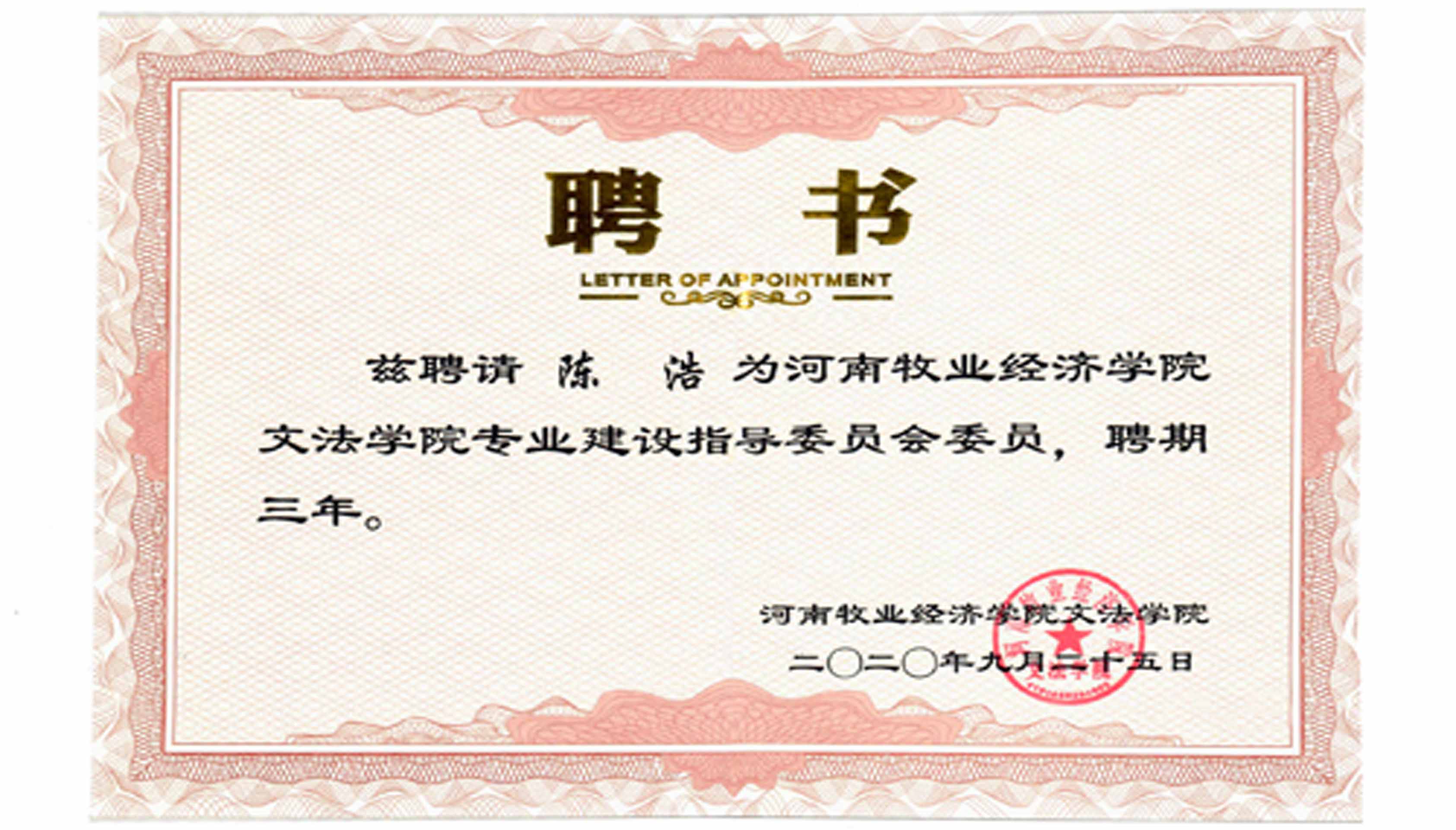 2020年9月公司總經(jīng)理陳浩被河南牧業(yè)經(jīng)濟學(xué)院(文法學(xué)院)聘為專業(yè)建設(shè)指導(dǎo)委員會會員。