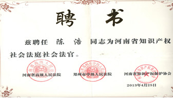 公司總經(jīng)理陳浩被聘任為“河南省知識產(chǎn)權社會法庭社會法官”。