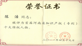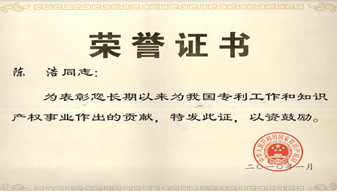 公司總經(jīng)理陳浩獲專利工作和知識產(chǎn)權事業(yè)作出貢獻的表彰證書。