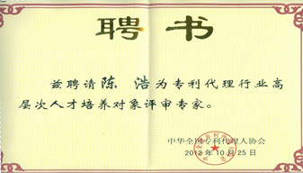 公司總經(jīng)理陳浩被聘為“專利代理行業(yè)高層次人才培養(yǎng)對象評審專家”。