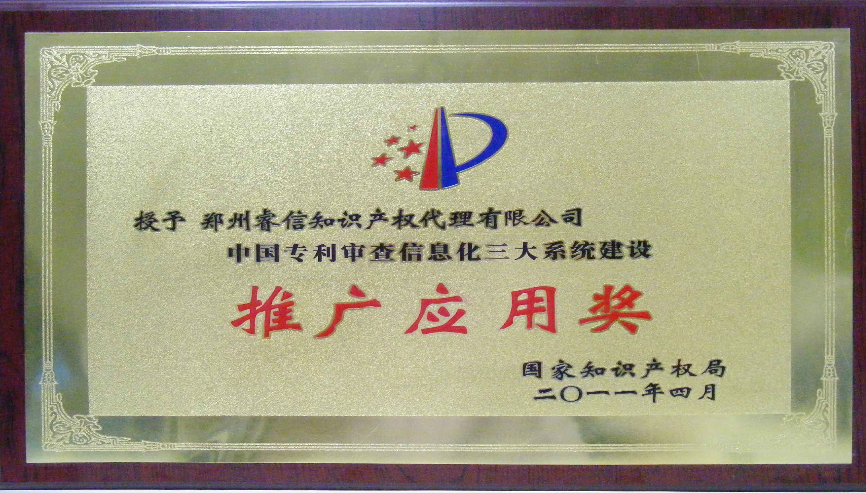 公司被國家知識產(chǎn)權局授予中國專利審查信息化三大系統(tǒng)建設推廣應用獎。