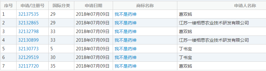 在生活中存在這樣一種現(xiàn)象:當(dāng)一部電影或者電視劇大火的時(shí)候,當(dāng)出現(xiàn)新的社會(huì)熱點(diǎn)的時(shí)候,總會(huì)刮起一陣商標(biāo)搶注的狂潮。電視劇如“花千骨”、“羋月傳”等,流行詞匯如“洪荒之力”、“老鐵”、“藍(lán)瘦香菇”等,當(dāng)它們進(jìn)入公眾視野的之時(shí)往往就有人將其搶注為商標(biāo)。在“藥神”如此火爆的情況下,搶注人自然不會(huì)放過(guò)這個(gè)熱點(diǎn),除了蜂擁而上搶注“我不是藥神”的電影名,連電影中出現(xiàn)的抗癌藥“格列寧”也沒(méi)能逃過(guò)“毒手”。以下是近期被搶注商標(biāo)列表: